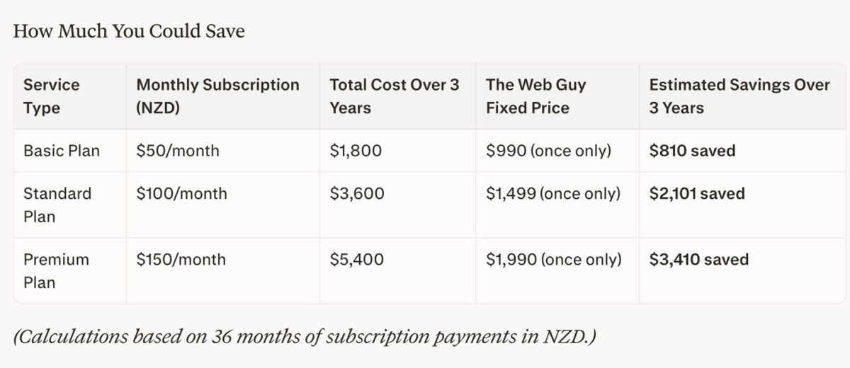 Most subscription-based web design plans charge between $100–$300 per month, often with additional fees for changes or upgrades. A fixed-price website gives you the same professional design and functionality without the recurring costs.